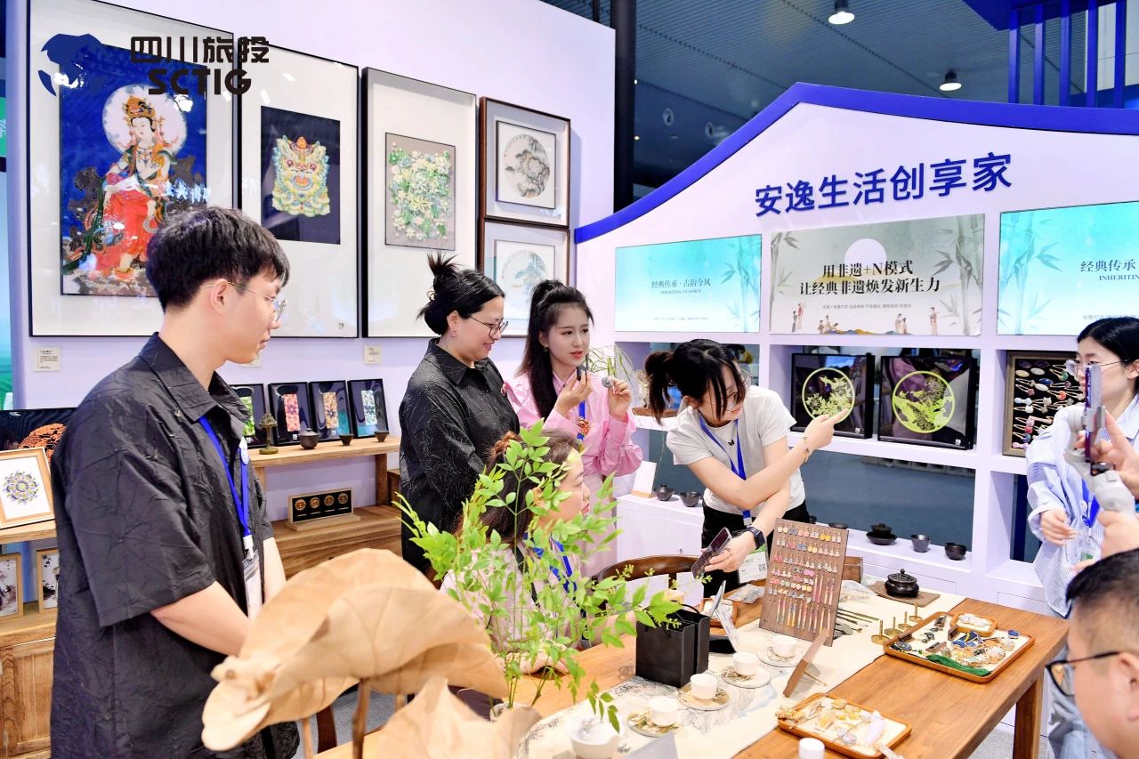 集團展館采用川西民居建筑風格融合現(xiàn)代時尚設計,結合“四川尊龍凱時”品牌形象的藍白主色調,藍色象征蜀地山水如詩如畫、文旅產業(yè)蓬勃發(fā)展,白色寓意巴蜀文化純凈厚重,天府文脈氣韻悠長,創(chuàng)意打造超130平方米沉浸式展區(qū)。精心規(guī)劃以推介銷售為導向的展陳布局,重點展示陳列集團文博文創(chuàng)產品、旅行社旅游產品、研學產品、大健康產品以及“天府安逸買”“有禮在四川“數(shù)字文旅平臺,充分展現(xiàn)集團“一體兩翼”發(fā)展戰(zhàn)略下的階段性成果。同時特邀集團品牌合作活動單位,共創(chuàng)非遺文創(chuàng)產品互動區(qū),沉浸式打造文旅融合的展陳空間,傳達文化和旅游相互賦能的深層價值,體現(xiàn)“詩和遠方”相得益彰。